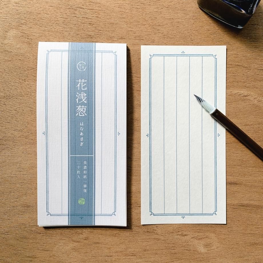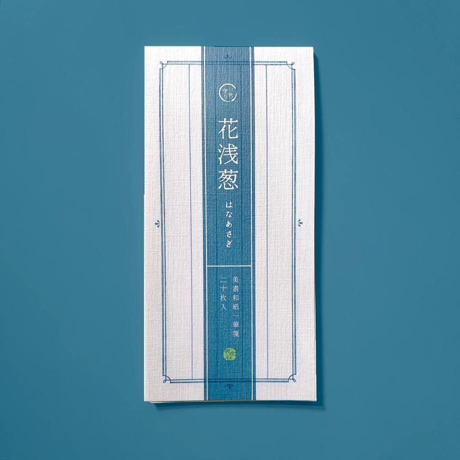花浅葱(はなあさぎ)とは、花いろがかった浅葱色・ツユクサで染め、わずかに緑を帯びた青色のこと。ツユクサとしずくをイメージした飾り罫がデザインされています。