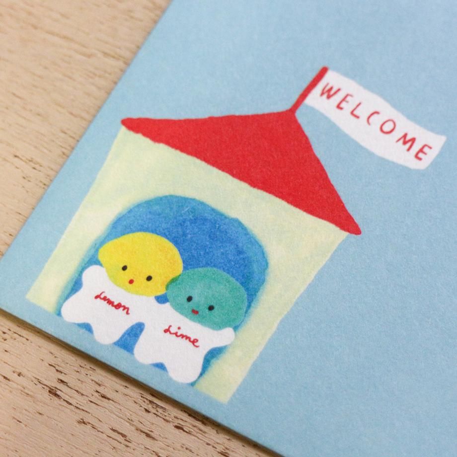 レモン&ライムとペンギンたちが描かれたレターセット。ペンギンが手を繋いでいたり、おうちに「WELCOME」の旗が立っていたり、レモン&ライムが防寒着を着ていたり、細かいところまでかわいいです!