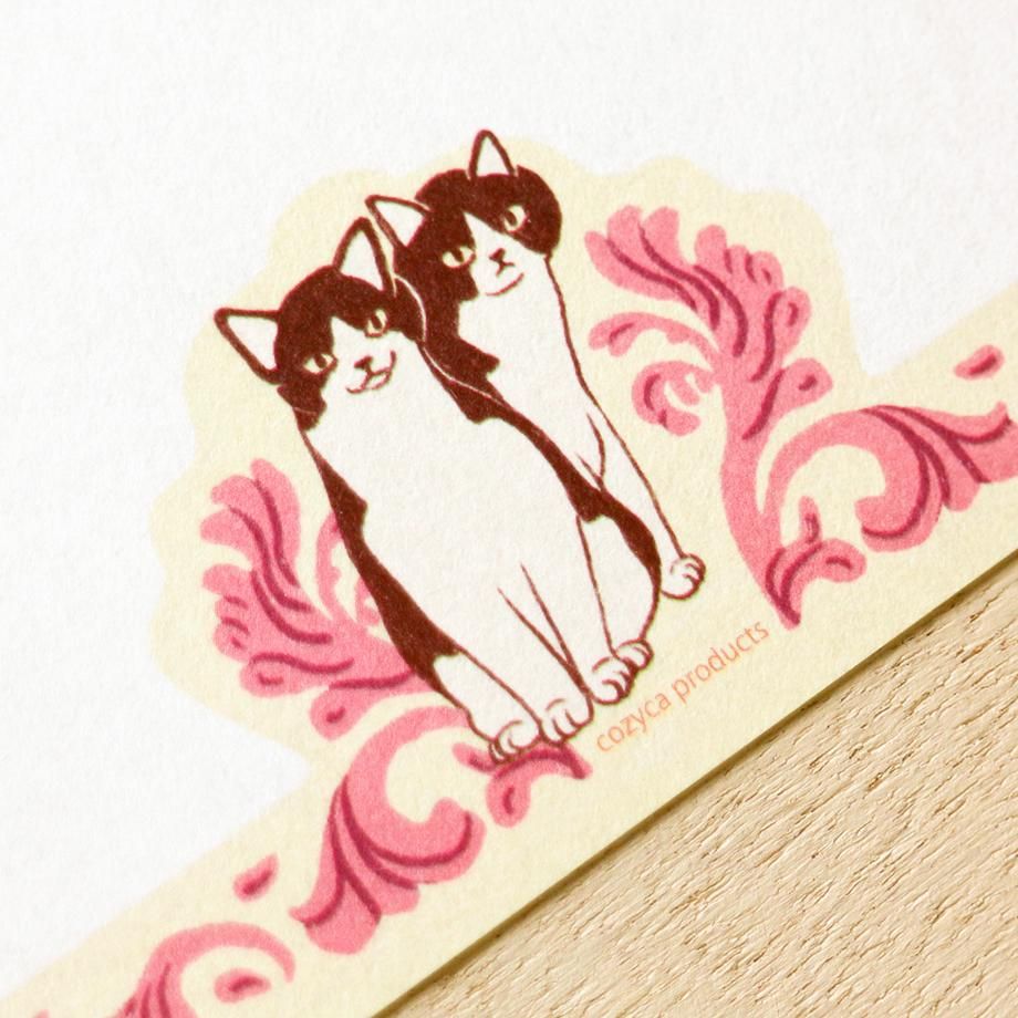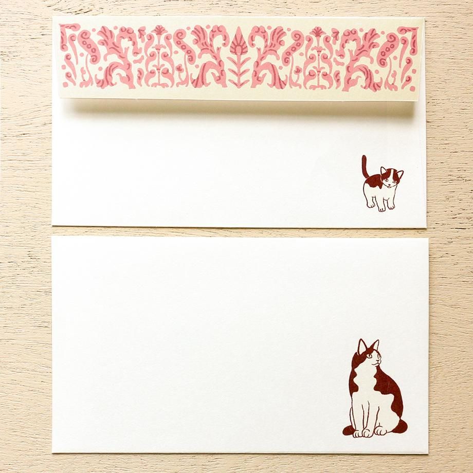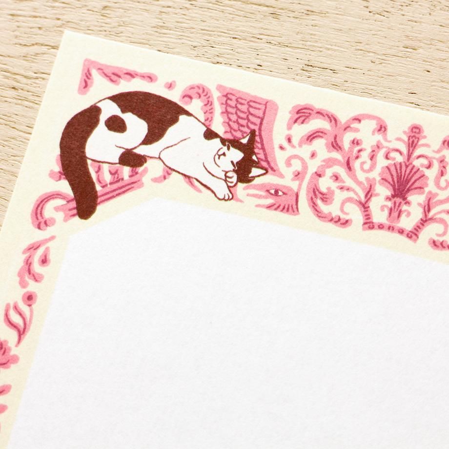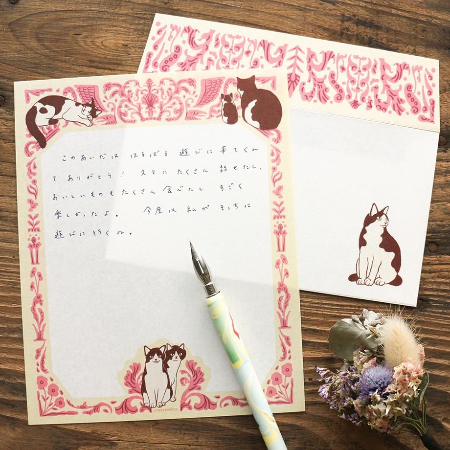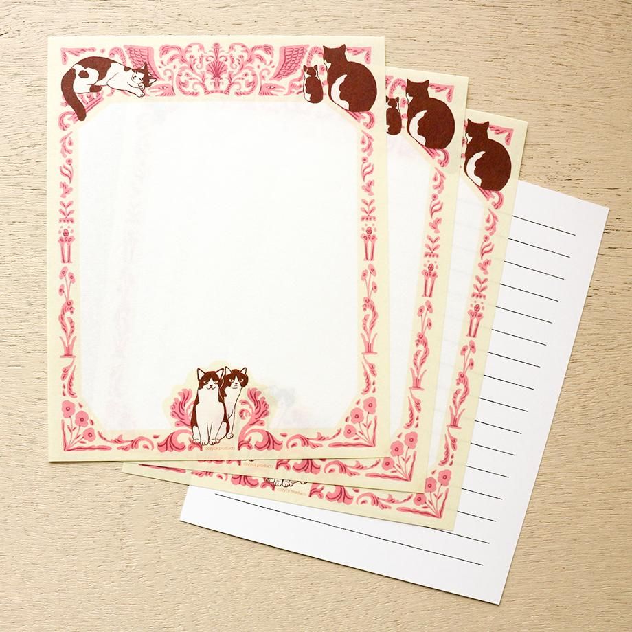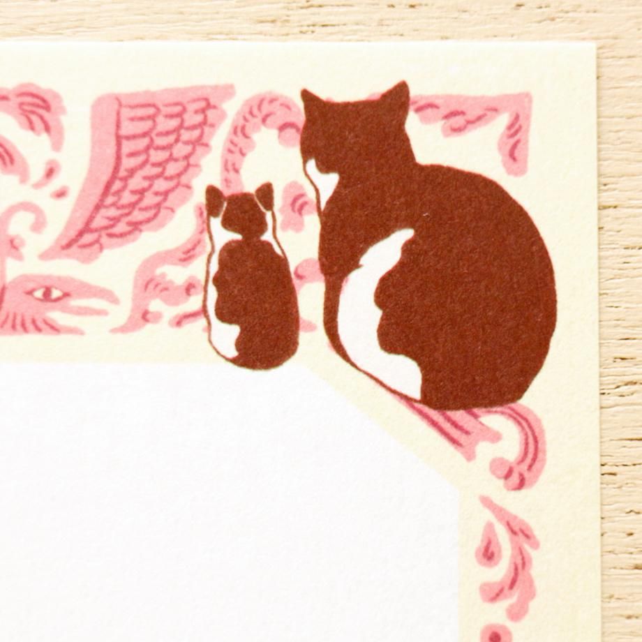 二匹の猫のまなざしとアールヌーボー調のフレームが印象的な、絵描き・谷小夏デザインのレターセット。