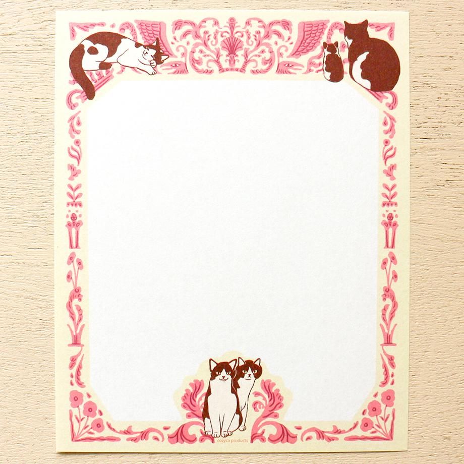 エレガントなフレームと二匹の猫が描かれた、谷小夏のおしゃれなレターセット。