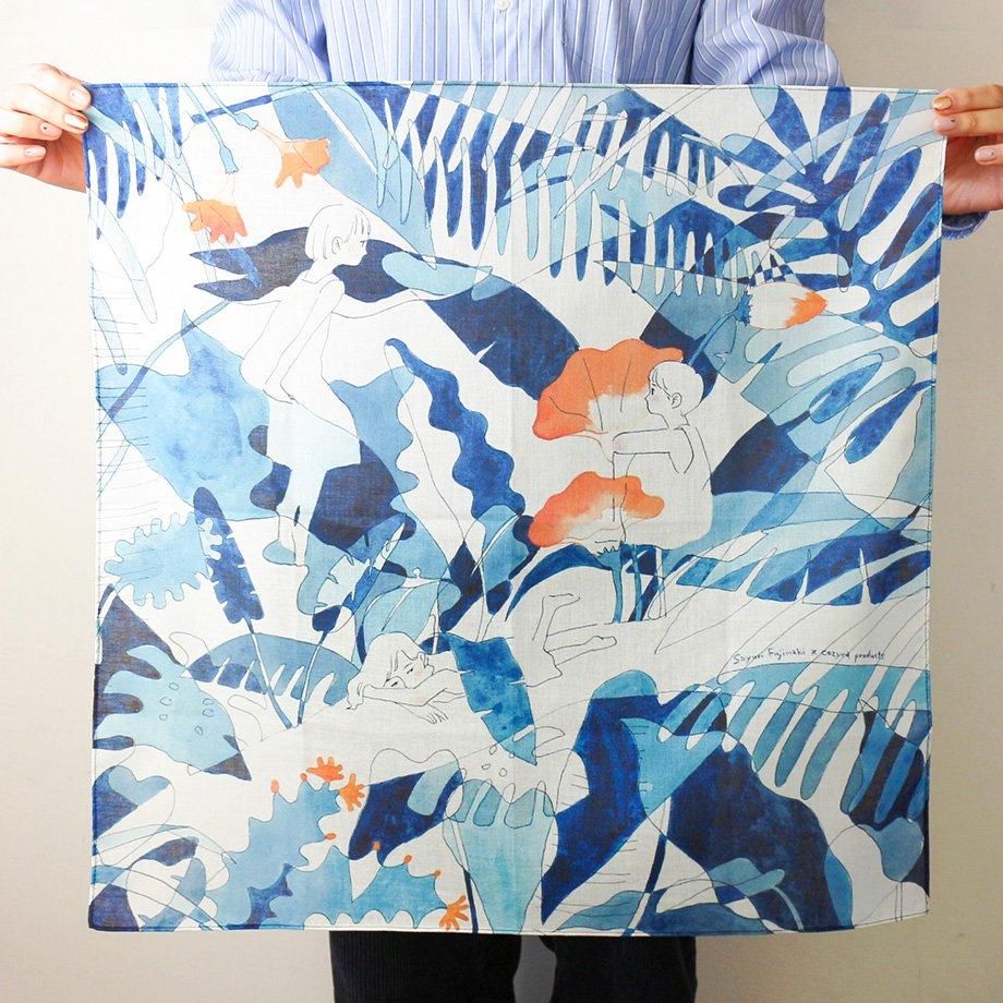 瑞々しい青色が印象的な、藤巻 佐有梨デザインのおしゃれな大判ハンカチ。